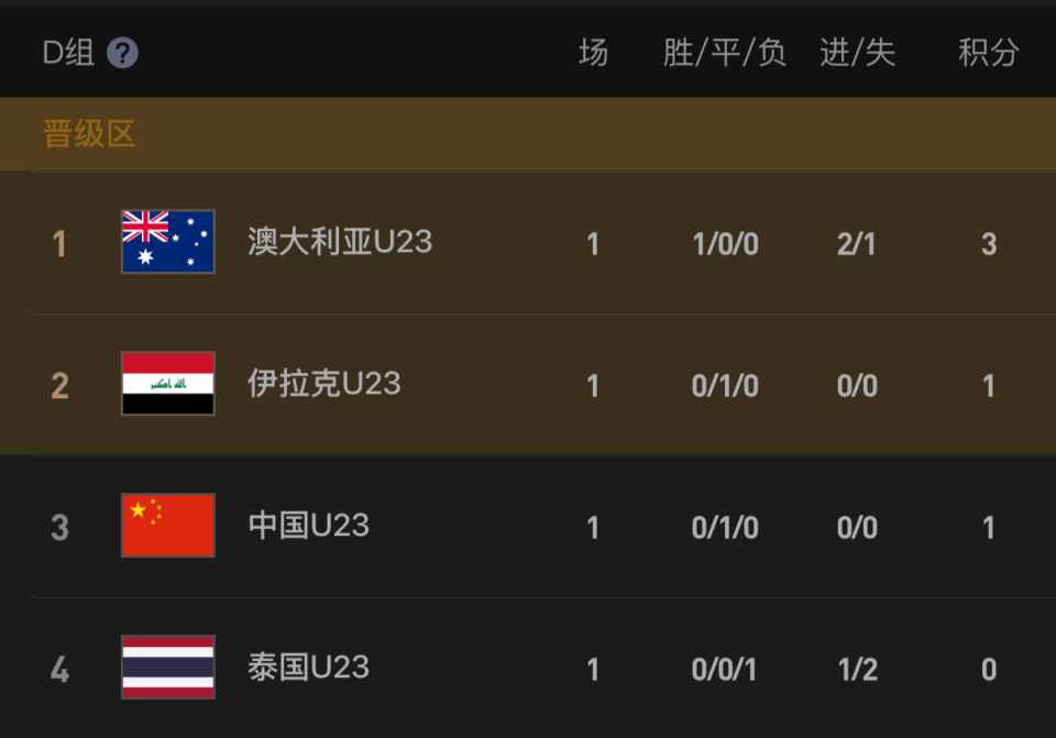 首轮战罢,澳大利亚队1胜积3分暂列榜首;U23国足和伊拉克都是1平积1分,U23国足多吃1张黄牌,屈居第3位,泰国队1负积0分排名小组垫底。