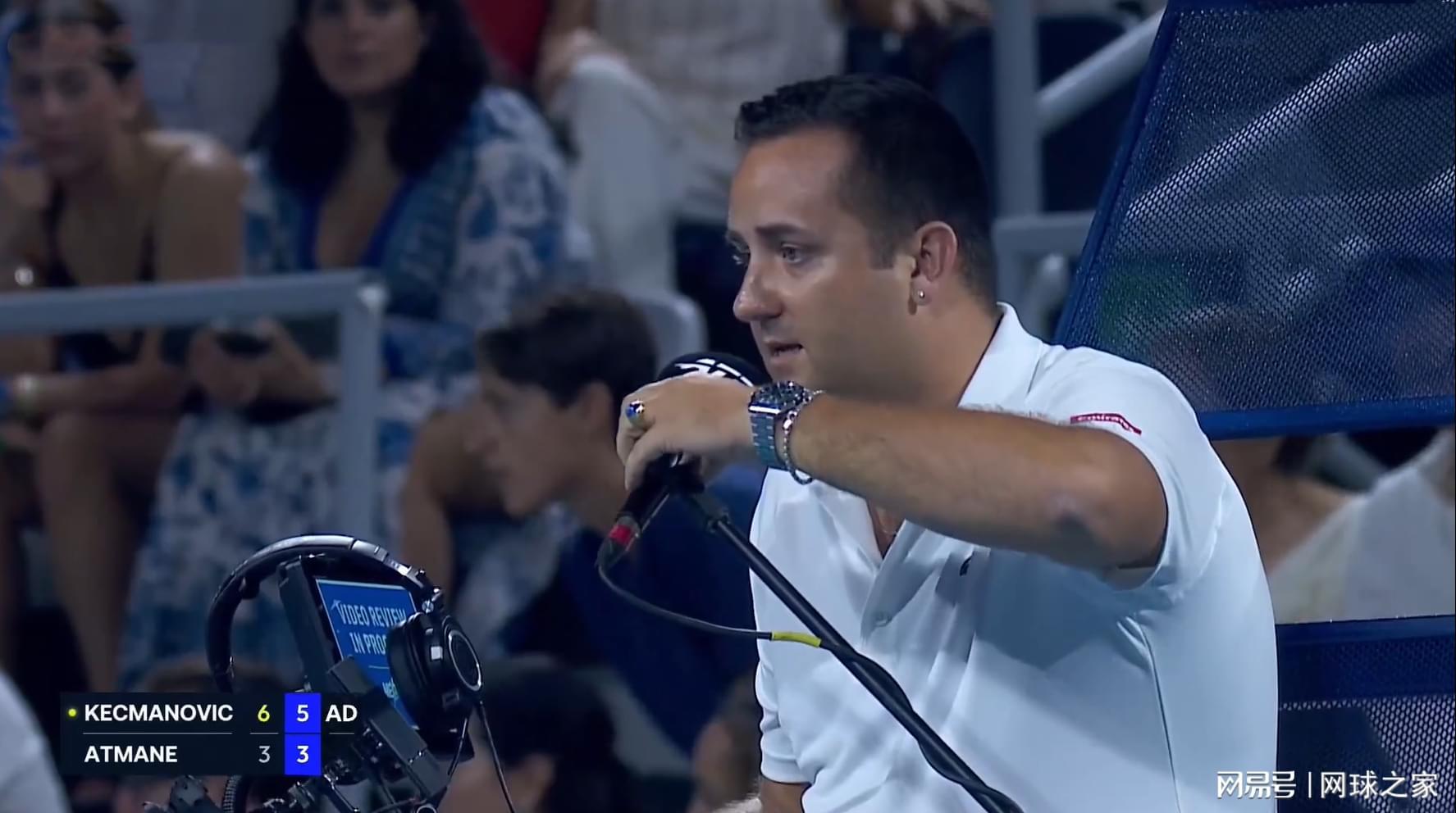 接发球的阿特马内以15-40落后,在挽救了2个赛点后两度将比分推进到局末平分deuce。凯兹曼诺维奇拿到第4个赛点时,他做好了发球准备,但阿特马内动作缓慢,迟迟没有做好接发球准备。